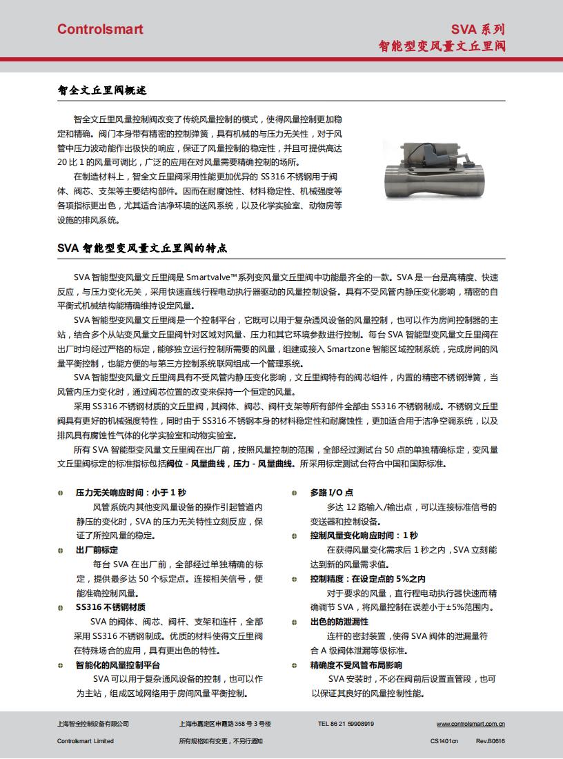 SVA智能型变风量文丘里阀是Smartvalve™系列变风量文丘里阀中功能齐全的一款。SVA是一台是高精度、快速反应,与压力变化无关,采用快速直线行程电动执行器驱动的风量控制设备。具有不受风管内静压变化影响,精密的自平衡式机械结构能准确维持设定风量。