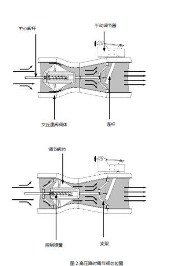 Smartvalve™系列定风量文丘里空气流量控制阀是高精度、高速反应的,与压力变化无关,并且不需要任何动力装置的风量控制设备。具有不受风管内静压变化影响,精密的自调式机械结构能准确持设定风量,配以适当的传感器,它可以提供准确的真实风量反馈。普遍应用于化学实验室、生物安全实验室、洁净室、动物饲养设施、压力房间、医院手术室等需要对风量进行准确控制的场合。定风量文丘里阀通过阀芯位置的改变来保持一个恒定的空气流量, 所有定风量阀都有一个阀芯组件,它带有一个内置的精密不锈钢弹簧,当风管静压较低时,作用在阀芯上的压力变小,阀芯中弹簧张开,低压力与大的流通面积的组合提供所需的风量(见图1);当出现高静压时,作用在阀芯上的压力增大,弹簧被压缩并且阀芯前移,减小了流通面积,保持高压力与较小开度的结合,维持了风量的稳定(见图2)。